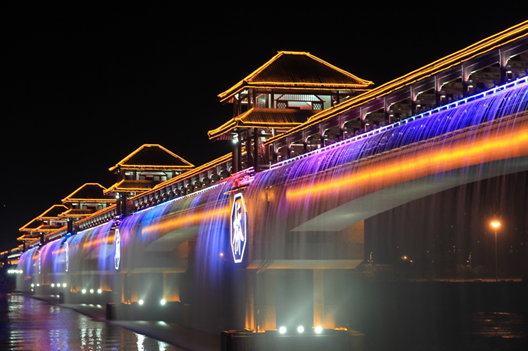 宝鸡渭河廊桥瀑布,水流如丝般从桥两侧抛下,在灯光的映衬下,在河道微风中,如少女翩翩的群摆,为廊桥增添了一道亮丽风景线。